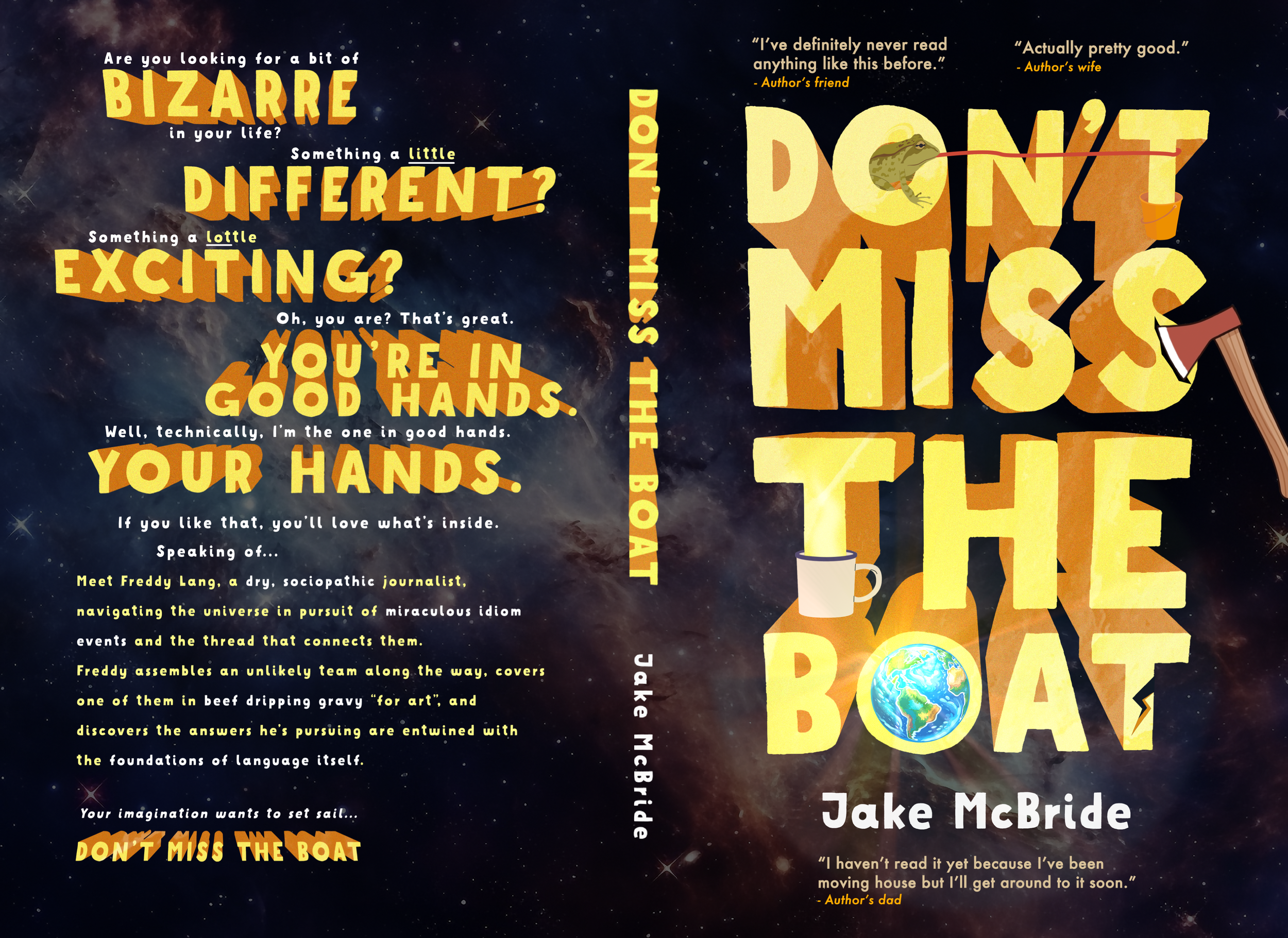 Don’t Miss The Boat 21 Nov Written By Jake McBride I’ve written my first novel! It’s a whacky sci-fi comedy, set in a world where wordplay reigns supreme. You can buy the digital/print here.Or you can listen to the audiobook here (Spotify) or here (Elevenlabs) Jake McBride https://www.animindstudio.com